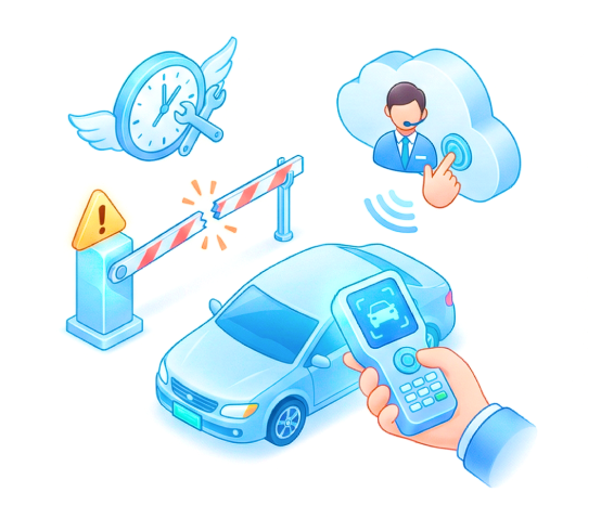 断电断网时手持机接管车牌识别计费,保障通行不间断;车主扫码触发云座席远程开闸;7×24小时运维,快速响应故障。