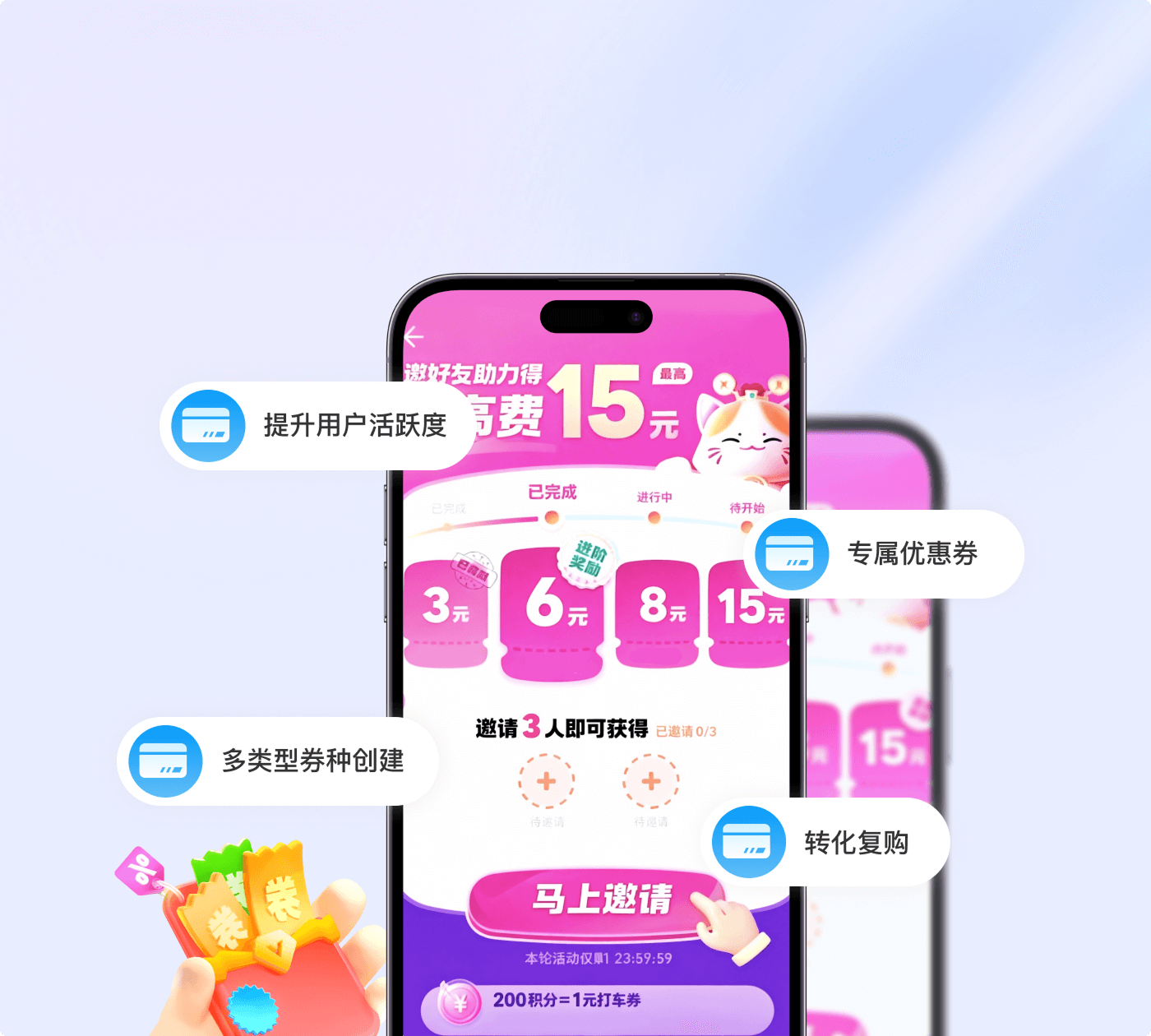 • 拉新裂变 - 好友助力、一元抢票、拼团砍价、积分兑换、老带新奖励、限时秒杀
